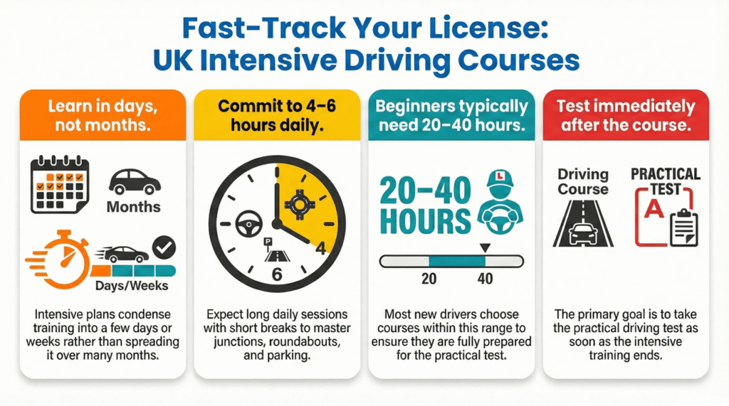 An intensive driving course normally lasts from one week up to two weeks for most learners. Some people choose longer courses if they need more time to feel ready for the test.
